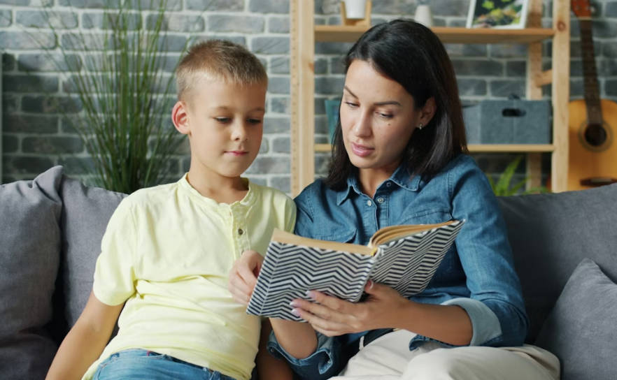 17개월 아기와 엄마가 TV 대신 그림책을 보며 건강하게 미디어를 사용하는 모습을 담은 일러스트